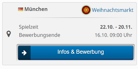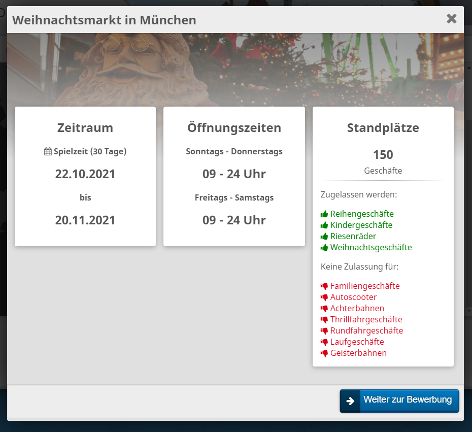 - [feature] In der Liste der Veranstaltungen wurde der Dialog mit den Infos der jeweiligen Veranstaltung ("Infos & Bewerbung") optisch überarbeitet. Neu ist die Information, welche Geschäftskategorien zugelassen werden und welche nicht. Dies gilt für alle Veranstaltungen, ist aber natürlich für Besitzer von Weihnachtsgeschäften am nützlichsten.