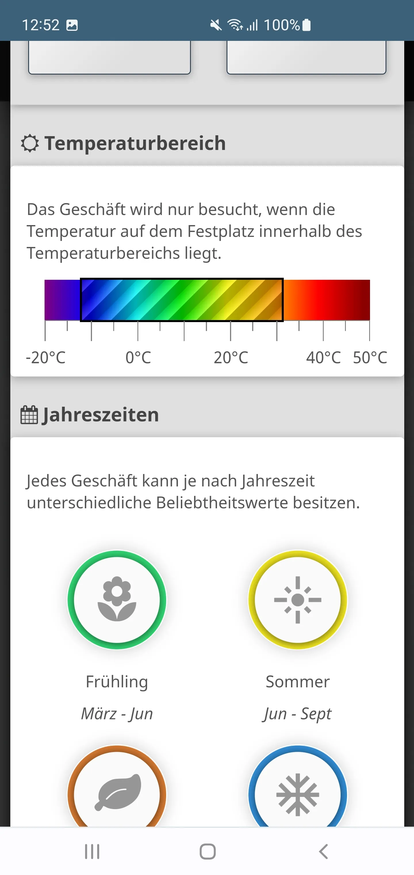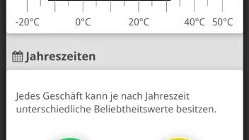 Jedes Geschäft hat unterschiedliche Temperaturgrenzen (hätten wir eine Wasserbahn im Spiel, würde die wahrscheinlich gerade sehr gut verdienen).Das Spiel würde keinen Spaß machen, wenn man die Einnahmen von jedem Platz im Voraus berechnen könnte. Wetter und Temperatur sind unsichere und nicht planbare Faktoren.