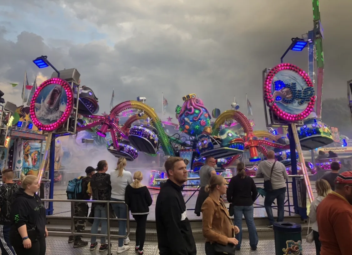 In der Mitte des Platzes sind auf einer Länge von ca 180 Metern die meisten Fahrgeschäfte zu finden und diese reihen sich dicht an dicht, so das hier so gut wie keine Verköstigung stattfinden kann. Dementsprechend laut übertrumpfen sich die Rekommandeure mit Sprach und und Musikeinlagen.So weit so gut und nichts besonderes und das besondere an diesem Markt ist auch kaum zu erklären, denn es hat eine ganz eigene Stimmung für sich. Während ich aufm Dom in HH oder aufm Freimarkt in Bremen oder oder bin, ist das hier gefühlt keine Kirmes sondern einfach eine riesige Party. Es ist den Betreibern hier deutlich anzumerken wieviel Spaß sie an ihrem treiben haben und gehen voll mit.