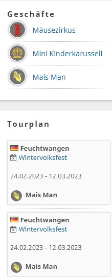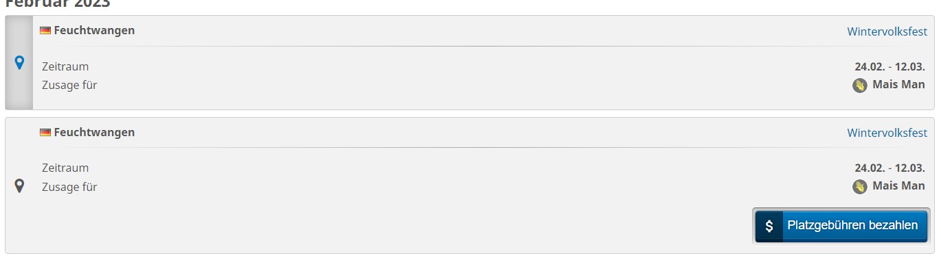 ich habe auf dem Platz in Feuchtwangen eine Zusage mit meinem Geschäft "Mais-Man" erhalten und dann festgestellt, dass die Veranstaltung sowohl unter "Orte" als auch im Tourplan doppelt angezeigt wird. Ich habe im Anhang einmal 2 Screenshots beigefügt.