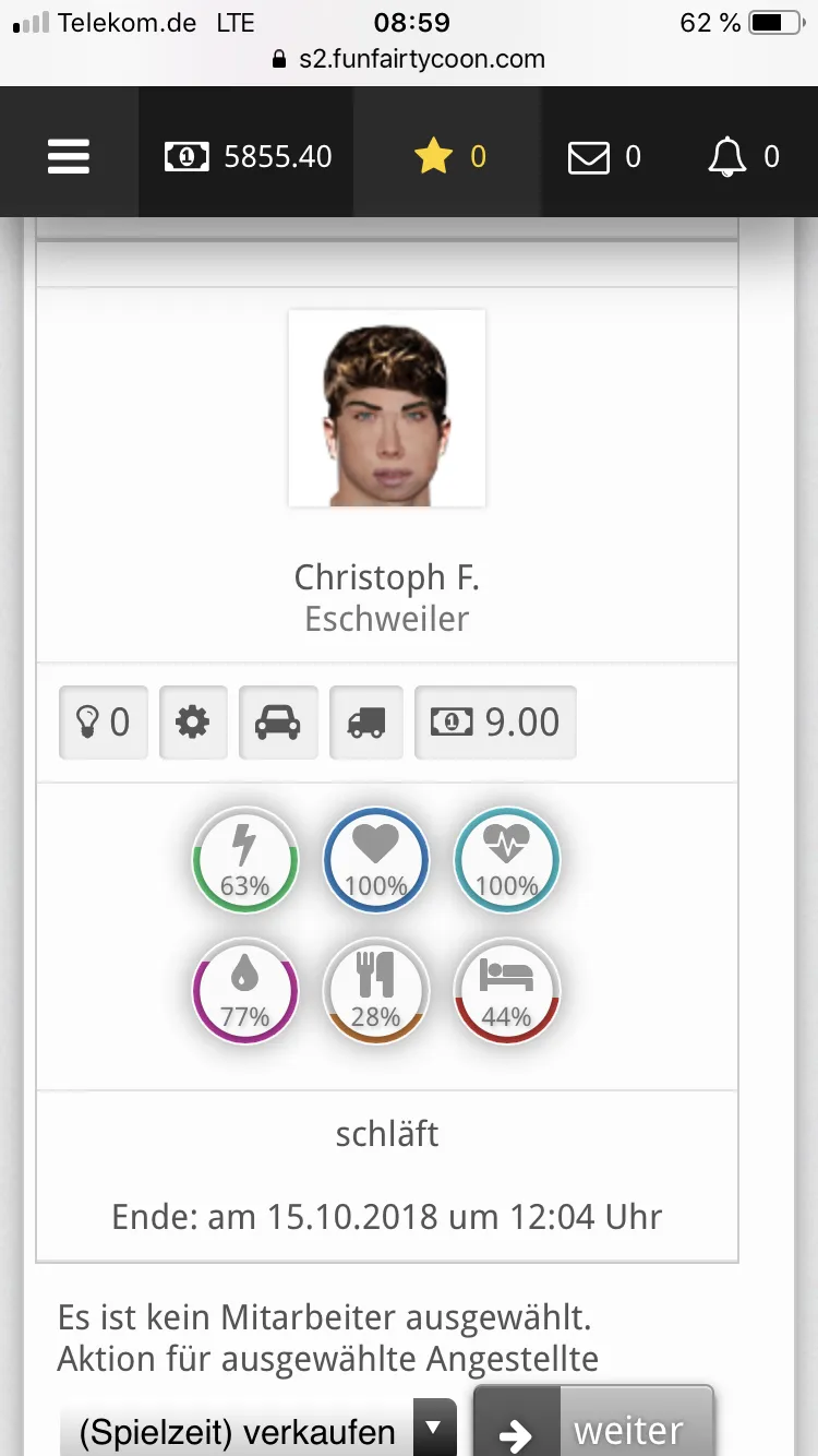 So, mir jetzt aufgefallen das mein mitarbeiter Luca. Bis 19.19 uhr geschlafen hat aber seine Müdigkeit nicht weniger geworden ist und er jetzt bei 43 Prozent ist! Wollt ihn jetzt eigentlich fit zur Arbeit schicken.