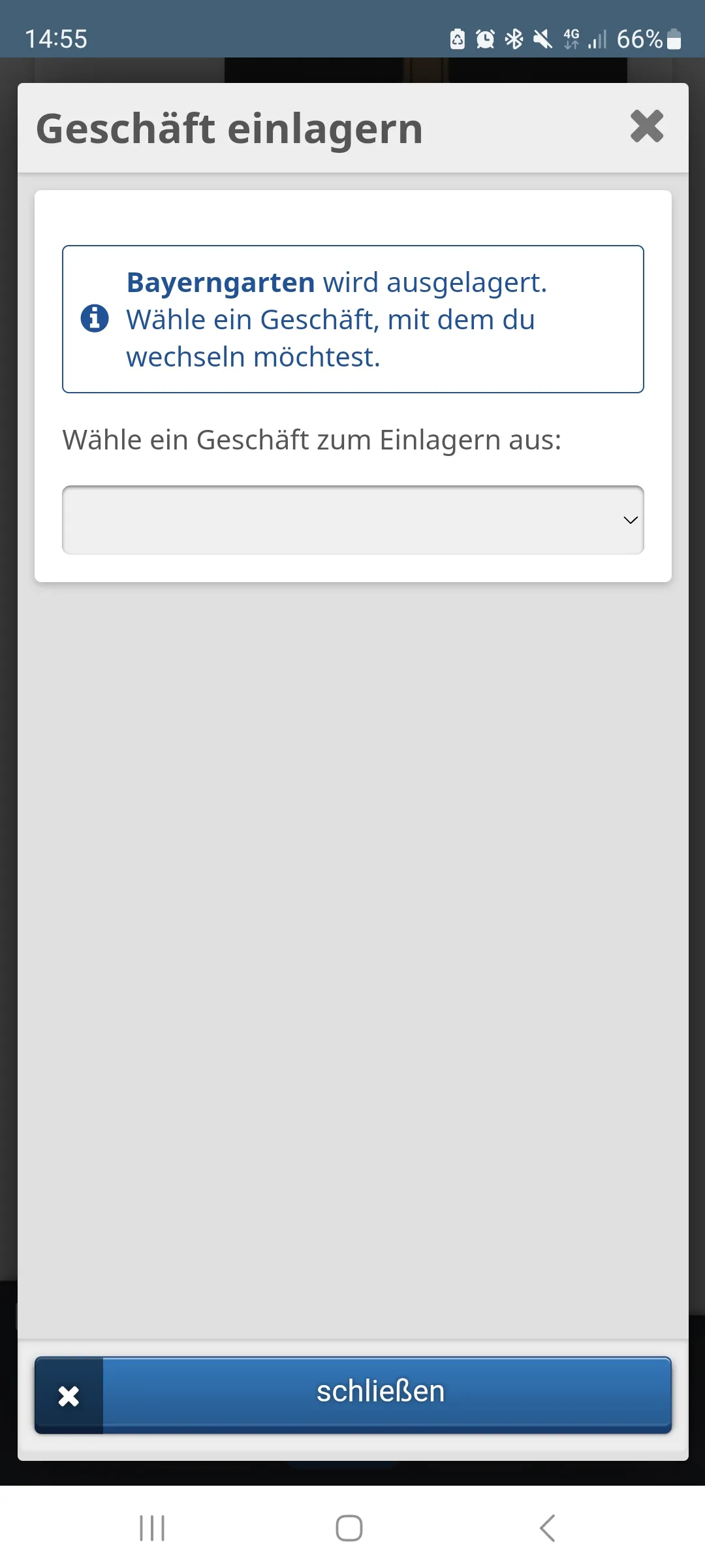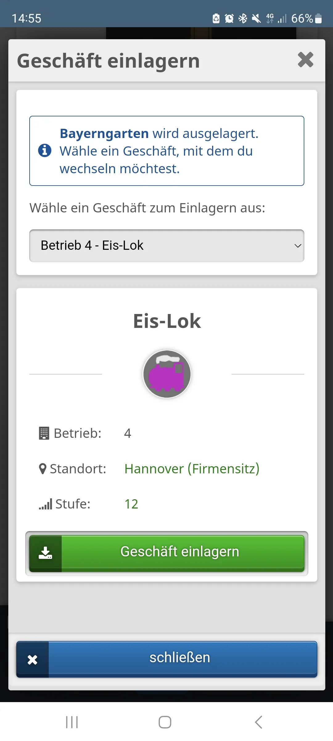 Um es einzulagern muss dein Lager gelevelt werden. Bisher kann es nur bis Level 9 Geschäfte aufnehmenOben steht aber "Bayerngarten wird ausgelagert" - Wenn er dieses Geschäft [Level 16] schon im Lager hat müsste das Lager schon auf Stufe 1 sein.