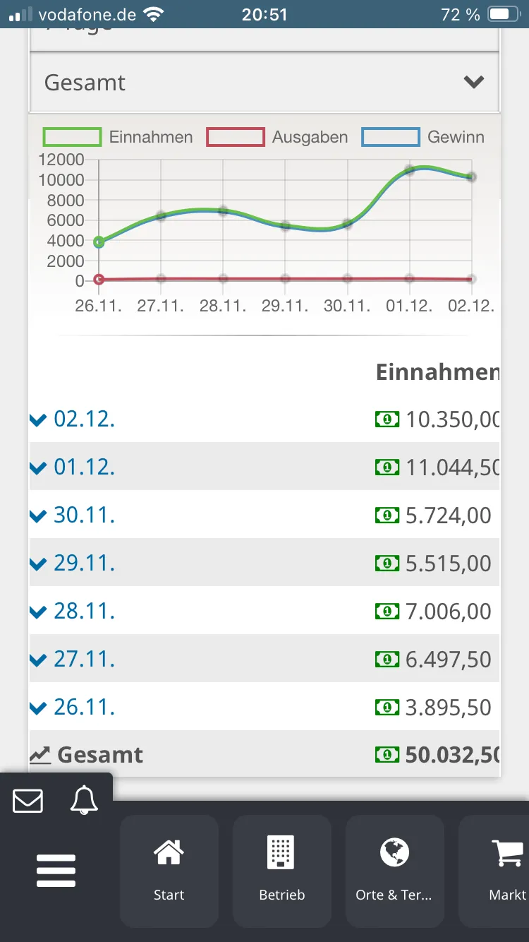 Aktuell stehst du noch auf dem Straßenfest. Dort sind die Einnahmen generell viel geringer als später auf den Festen.