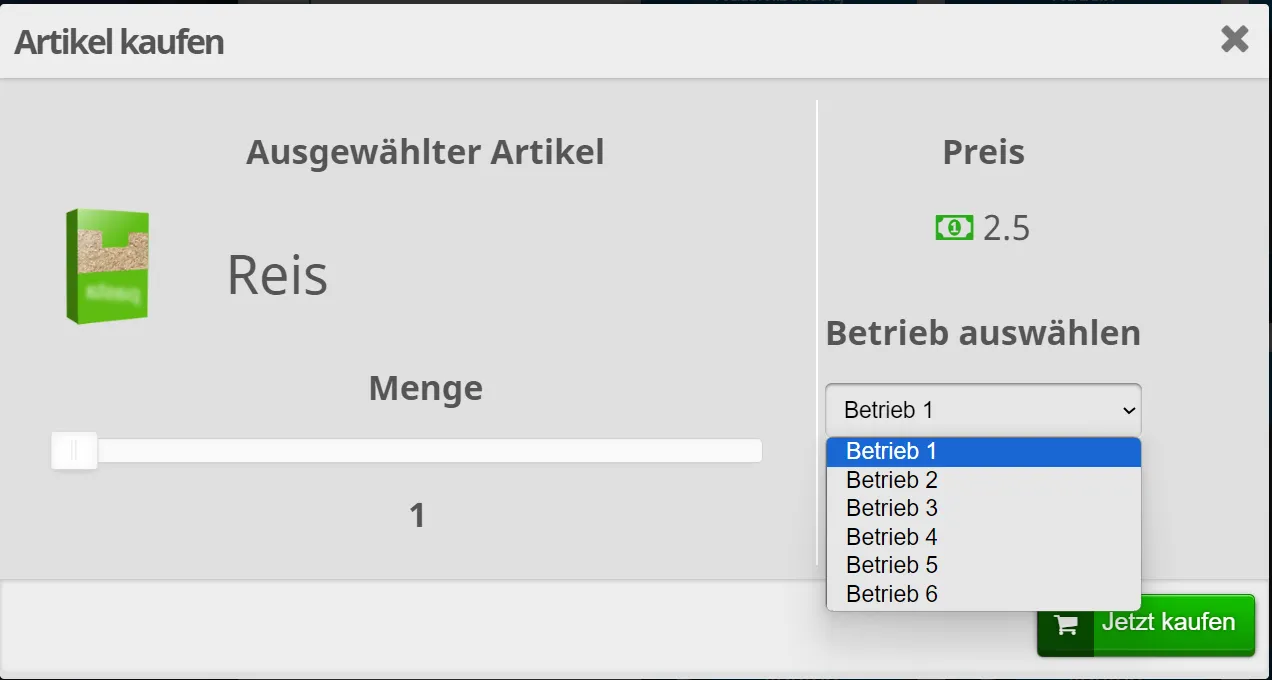 Es wird immer erst für Betrieb 1 eingekauft du musst dann auf den Betrieb wechseln wofür du Einkaufen möchtest.