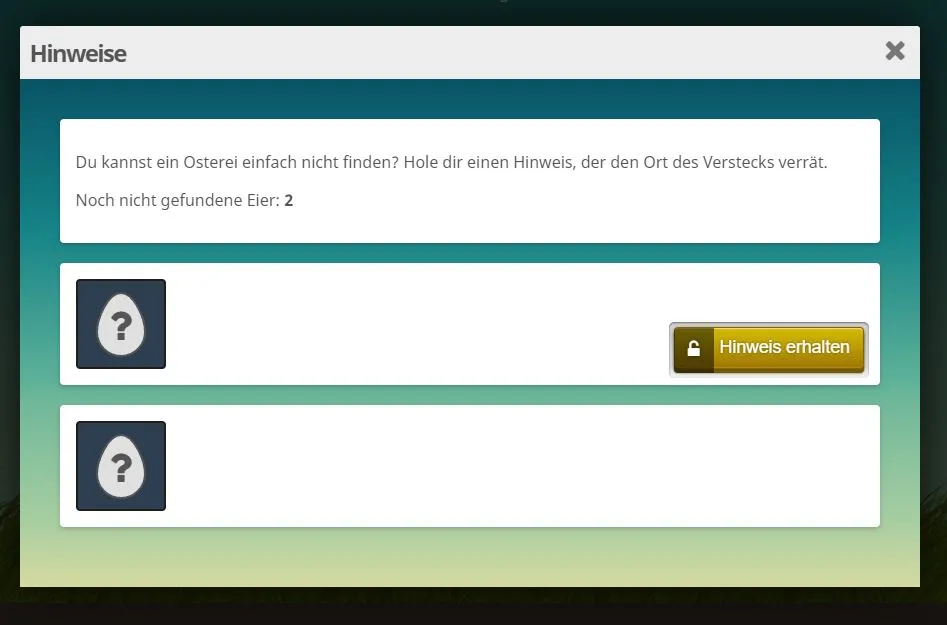Nimm dir Zeit! Du kannst bis Ende des Events noch alles einsammeln. Optional kannst du auch für jedes Ei einen Hinweis bekommen.