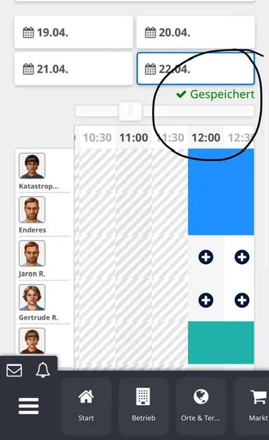 Ich gebe mal folgendes Feedback. Ich empfinde es als Stören am Smartphone, dass die Angabe „gespeichert“ beim Anklicken des speichern des Dienstplanes nicht zu erkennen ist.