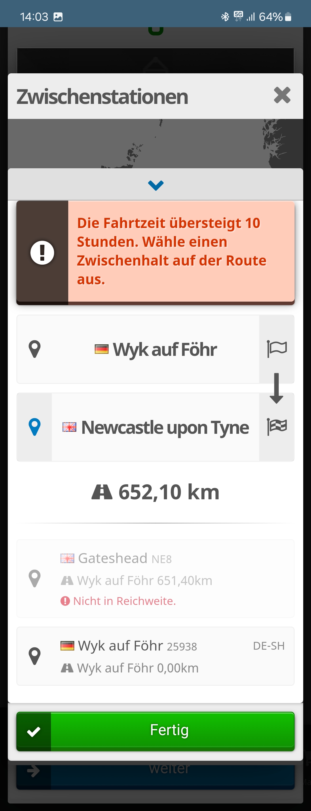 @Firefighter4992 In deinem Fall befindest du dich jetzt an einem Ort der per Luftlinie über knapp über 650 km von GB entfernt liegt. Dies ist so nur mit LKW ab Level 25 möglich. Da wegen der Nordsee kein Ort zwischen Wyk auf Föhr und Newcastle auf der Luftlinie gefunden werden kann, siehst du das, was du siehst. Am besten du schaust auf http://www.Luftlinie.org , wie weit du etwa nach Süden/Südwesten Richtung Niederlanden fahren musst, um unter die Maximaldistanz (das 10fache der Höchstgeschwindigkeit) zu kommen.