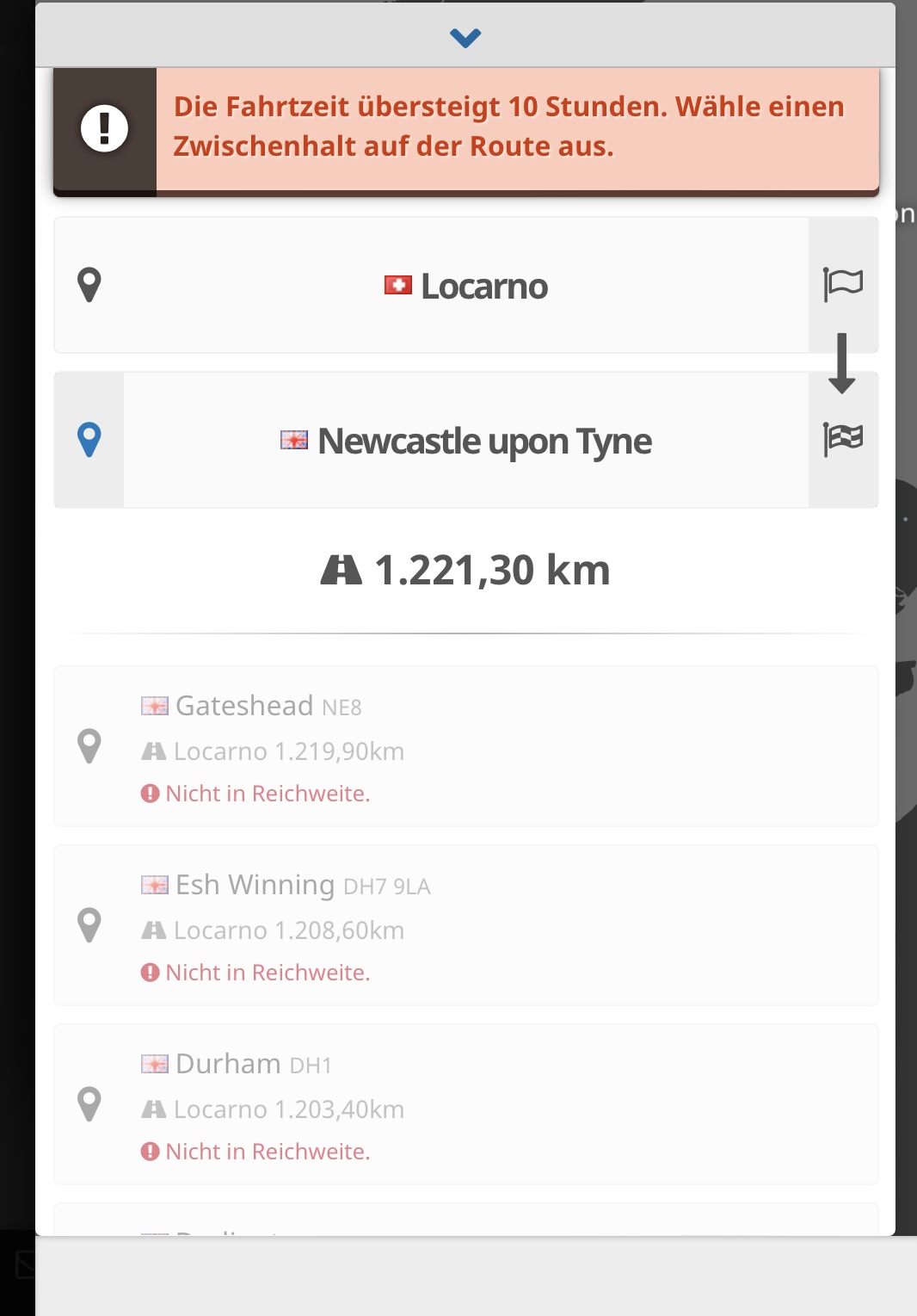 Wenn berechneten Distanzen 10 Stunden überschreiten, werden Zwischenstopps in der nähe der Luftlinie angezeigt.