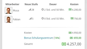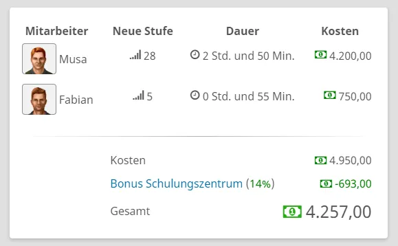 Die Mitarbeiter müssen dafür nicht am Firmensitz sein. Wenn du Mitarbeiter weiterbildest, wird dir bei den Kosten der Effekt des Schulungszentrums direkt angezeigt.