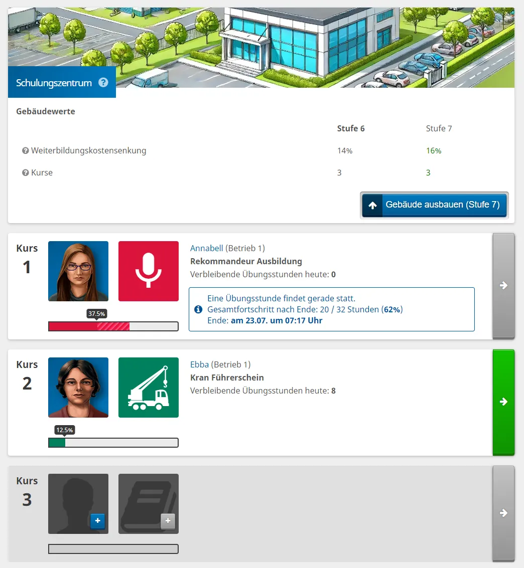 Das Schulungszentrum kann nur ein mal auf dem Firmensitz gebaut werden. Es hat mehrere Ausbaustufen, mit denen sich die Werte des Gebäudes erhöhen.