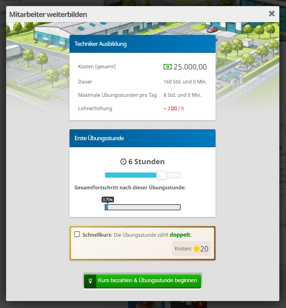 - Weiterbildungskostensenkung: Ein Bonus, der die allgemeinen Kosten der Weiterbildung von Mitarbeitern in allen Betrieben senkt. Je höher die Stufe des Schulungszentrums, desto höher der Bonus
