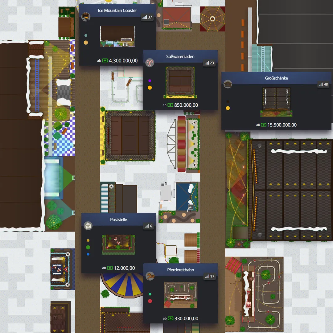 Im Markt unter der Kategorie "Weihnachtsgeschäfte" gibt es genaue Informationen zur Wintersaison in Funfair Tycoon, auch häufig gestellte Fragen werden dort beantwortet.