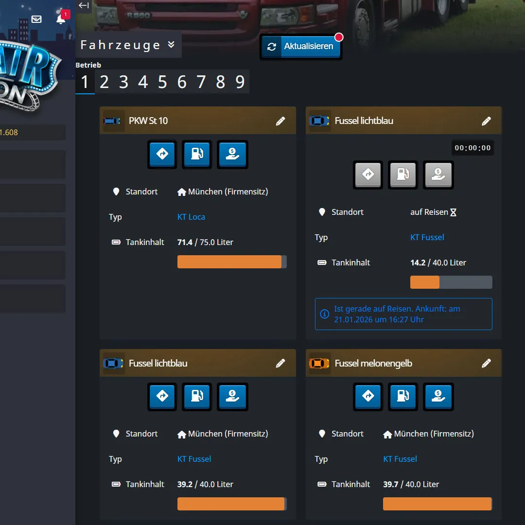 Euer Feedback war klar: Die Timer im Spiel sind praktisch, oft aber führt das automatische Neuladen zu Problemen (z.B. wenn man Fahrzeuge innerhalb der selben Stadt zum Tanken fährt und das Spiel mehrmals neu lädt). Ab sofort passieren diese Reloads nicht mehr, stattdessen wird im oberen Bereich der Seite ein "aktualisieren" Button angezeigt, mit dem ihr den Reload selbst auslösen könnt. Der Button wird immer nur dann angezeigt, wenn es auch wirklich etwas zum Aktualisieren gibt.