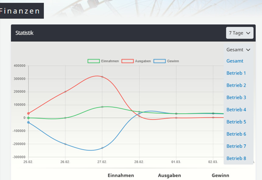 Hallo gibt es eine Möglichkeit die Umsätze für jedes einzelne Geschäft pro Tag einzusehen außer Wenn ich die Kasse nicht leere. Wäre mal interessant um auf Dauer zu sehen wie sehr sich das jeweilige Geschäft Lohnt. Falls es das nicht gibt wäre es nochmal eine Option mit einzubinden. Ansonsten ist dieses Spiel so mega geil.![]()