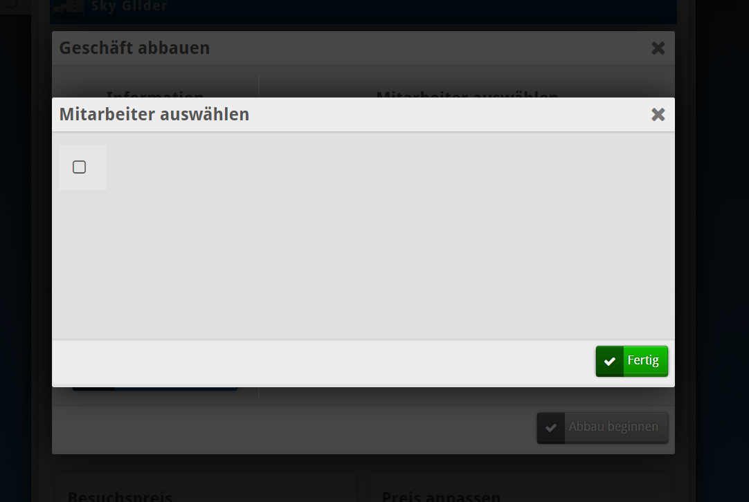 29. April 2019 um 13:30 #1 Irgendwie kann ich mein Geschäft (sky Glider) nicht abbauen. Alle Arbeiter sind fit, aber wenn ich abbauen will, ist die Liste der verfügbaren Arbeiter leer