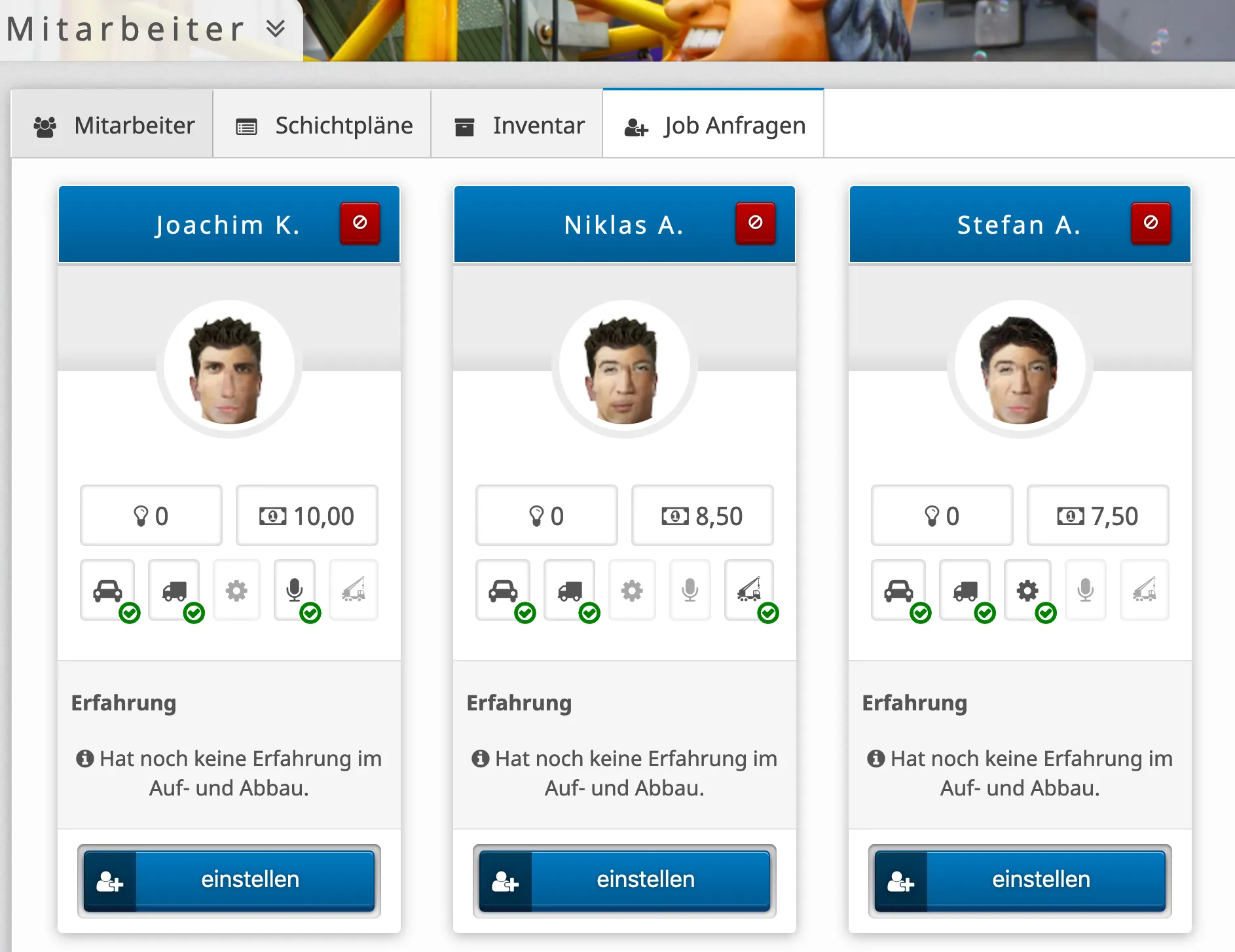 • Also ich würde es mit den Future besser finden. So kann man sich am Anfang Mitarbeiter aussuchen und dann sehr sehr Langfristig mit denen Arbeiten. Auch wenn es dann etwas mehr kostet. Desweiteren würde ich es gut finden wenn Mitarbeiter die man im Geschäft einsetzt xp verdienen. Welche dann als bsp. Weitere Spezielle ausbildungen ermöglichen.