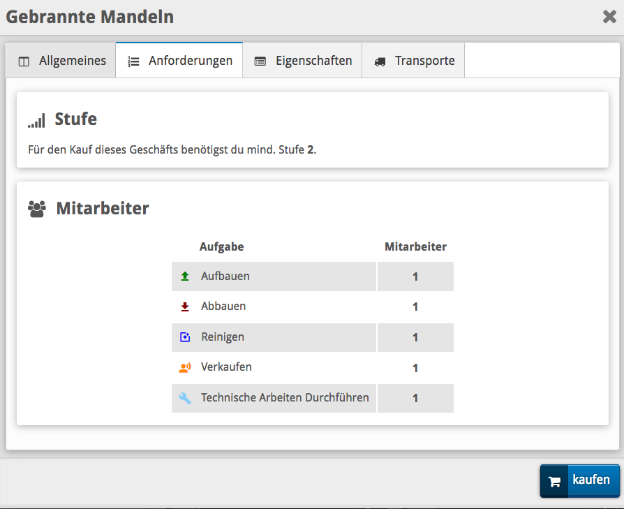 • Wenn ich mir später ein neues Geschäft zulegen möchte, wird in der Anforderung angezeigt das ich es nur erwerben kann wenn ich mind. Stufe 2 habe.