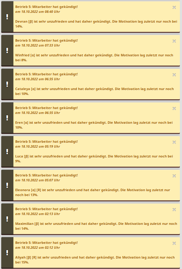 du sagst doch selbst das du rein schaust um die Schichten einzustellen dabei sieht man ja schon mal den Zustand der Mitarbeiter in % auch die Motivation da du ja durch das Mitarbeiter Fenster klickst. Und ist es dann so viel mehr Zeitaufwand auf Inventar zu klicken und zu schauen was da los ist? Ich mein du musstest bei KT ja jeden Mitarbeiter selbst einstellen das hat noch mehr zeit gekostet vor alledem auch unter Tags jetzt musst du nur einmal am Tag rein schauen das alles läuft und halt auch schauen ob du alles hast. Weiß nicht warum man das System groß Überarbeiten sollte und du kannst ja auch einfach einmal ca 100x Essen und Duschgel auf einmal kaufen dann reicht das ewig. Und eine Benachrichtigung ist auch schnell mal übersehen daher einfach rein schauen und gut meiner Meinung nach .