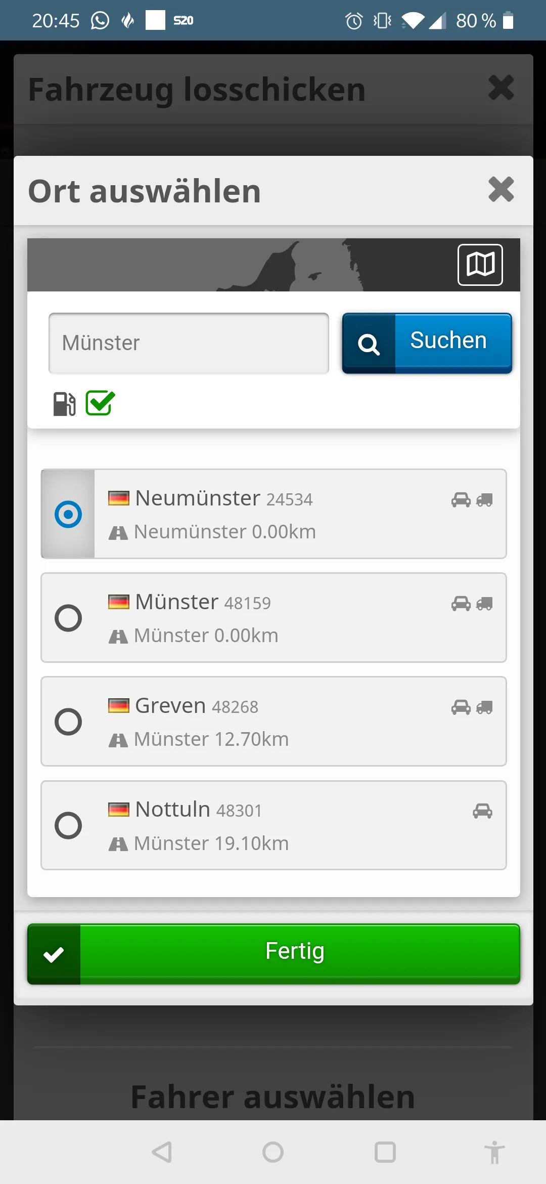 Deshalb werden beide Orte in der Suche gefunden.In der Tankstellensuche werden zu allen mit dem Suchbegriff übereinstimmenden Orte außerdem noch Tankstellen im Umkreis von 20km angezeigt. Daher die Distanzangabe.