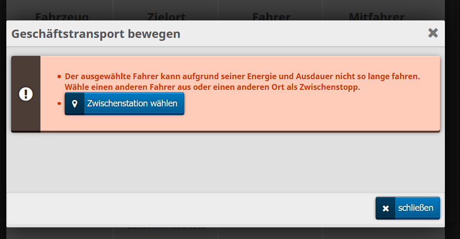 • Da deine Mitarbeiter nicht genug Ausdauer haben, musst du in einzelnen Etappen zum Ziel fahren. Dies machst du, indem du auf "Zwischenstation wählen" klickst und dann ein Ziel aussuchst, wofür die Ausdauer noch reicht. Dort machen sie dann eine kleine Essenspause und dann kannst du sie zum nächsten Halt schicken. Dies machst du solange, bis du an deinem Endziel angekommen bist.
