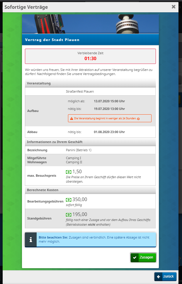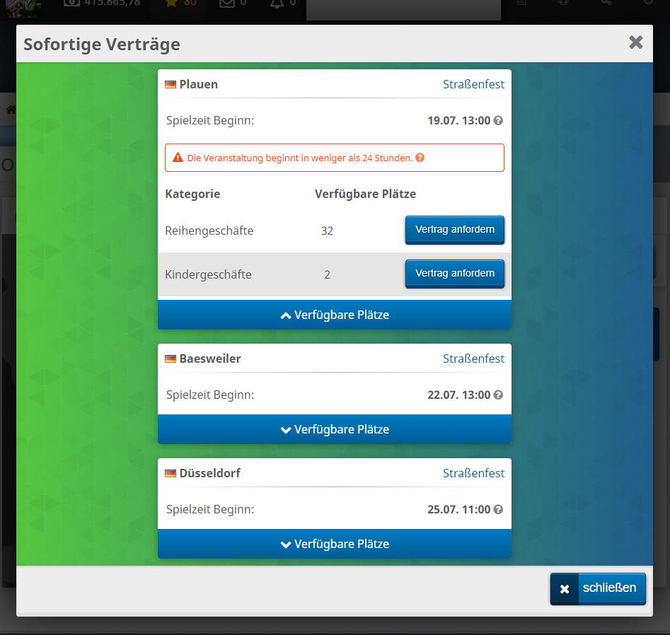 - [behoben] Der Aufbau des Geschäfts muss immer bis Spielzeitbeginn abgeschlossen sein. Man konnte jedoch sein Geschäft aufbauen, wenn das Aufbauende nach Betriebsschluss lag.