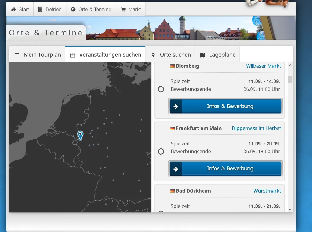 Wenn man Veranstaltungen sucht, sehe ich nur 2-3 kommende Veranstaltungen. Gerade wenn man einen längeren Tourplan erstellen möchte, sehe ich da Probleme auf mich zukommen. Ich vermisse die Übersichtliochkeit aus KT.