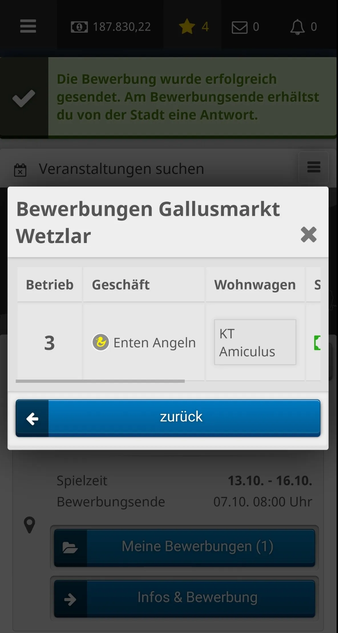 • Es wäre super, wenn man im Tourplan noch paar Daten sehen könnte. Bei der zugesagten Veranstaltung zum Beispiel, ob man seine Wohnwagen angegeben hat. Da Ich gerade einen nicht aufbauen konnte,Zweifel Ich nun daran, dass Ich morgen meinen vom Straßenfest aufbauen kann :D
