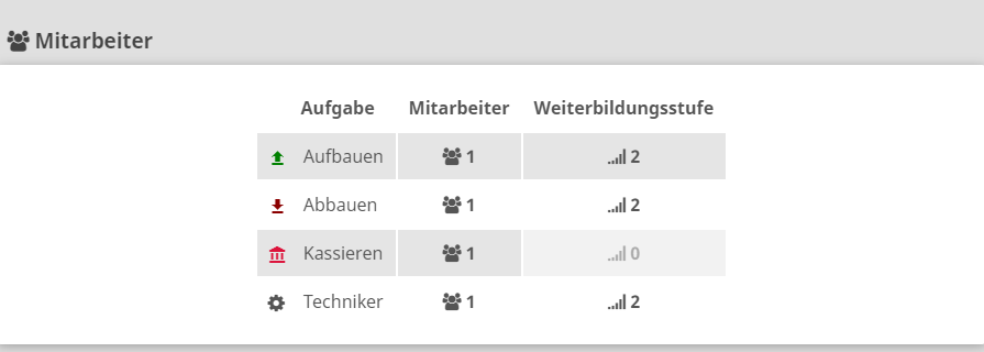 - [neu] Bei der Auflistung der Mitarbeiter für den Auf- und Abbau wird nun ebenfalls das benötigte Level angezeigt