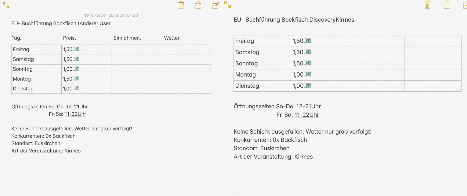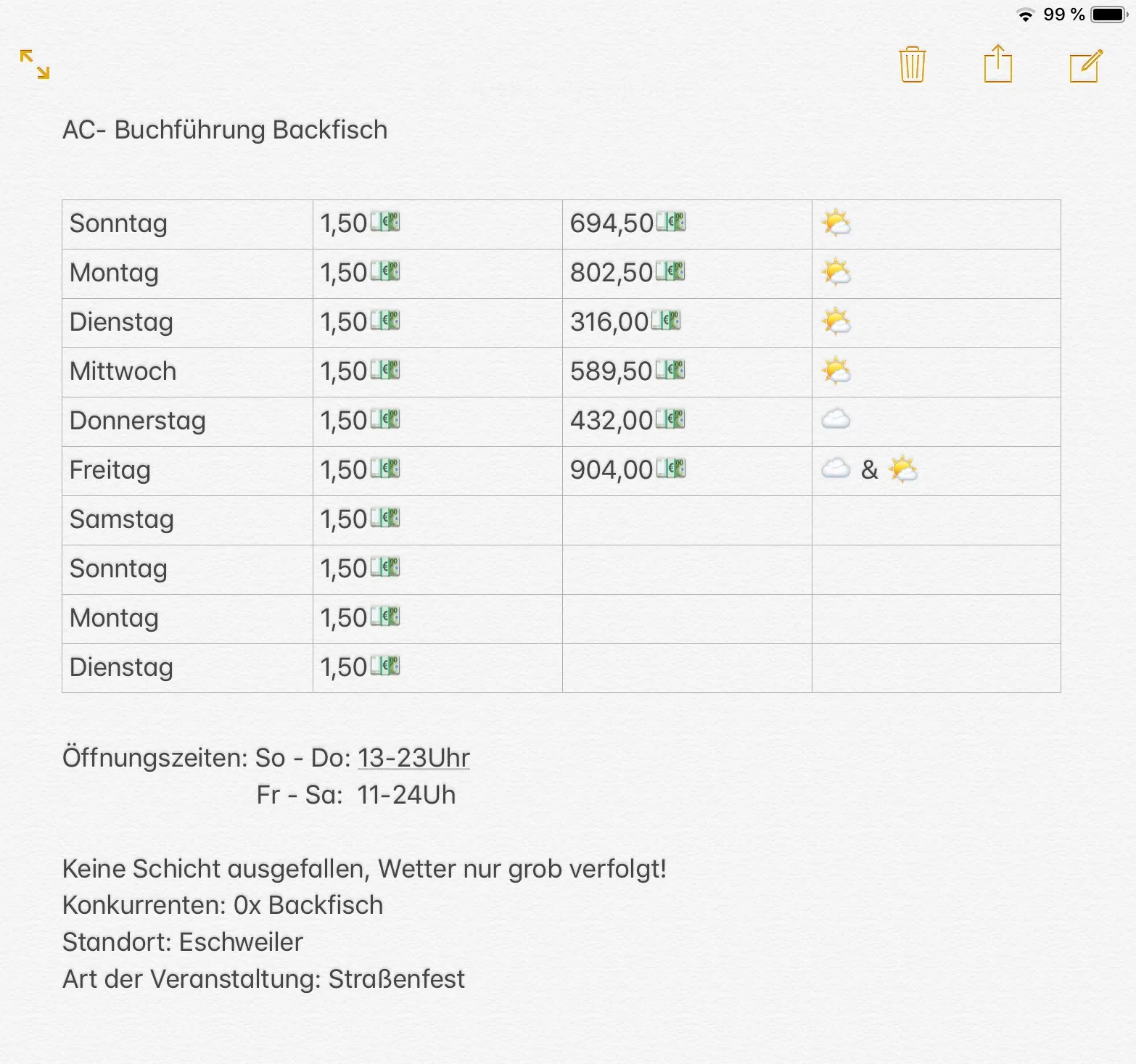 In einem Beitrag haben wir mal darüber geschrieben, die Einnahmen auf einem Platz festzuhalten. Gleiche Preise, mal einer Günstiger einer Teurer. Suche einen freiwilligen oder gerne auch 3, die versuchen herauszufinden wie das Einnahme mäßig läuft und Festhalten. Am besten auch in Euskirchen stehen.Bsp. 4x Backfisch