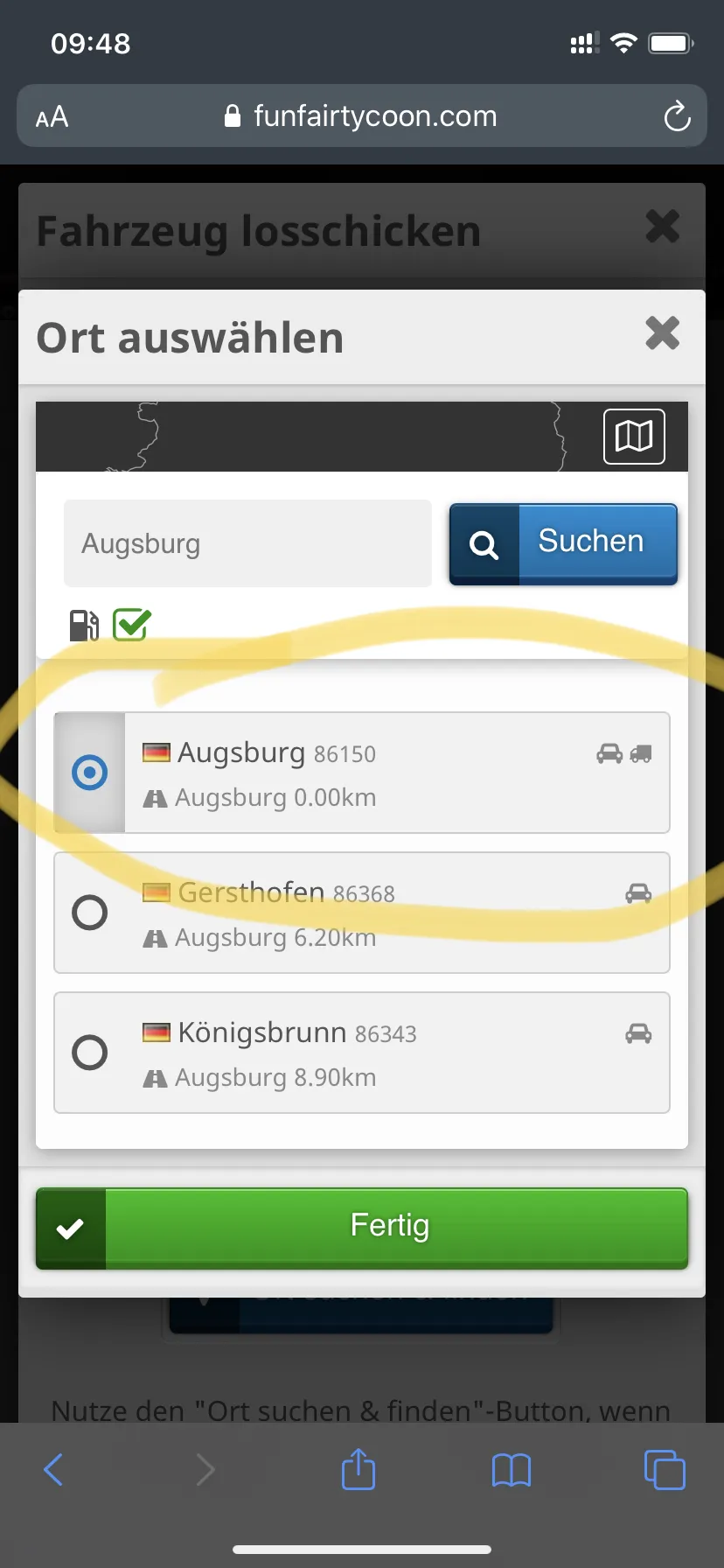 An dem Ort wo du stehst, ist auch eine Tankstelle. Gehe zum Fahrzeug Menü, wähle das Ziel Symbol des betroffenen Fahrzeugs aus und dann öffnet sich ja das Fenster für die Zielstadt auszuwählen. Dann haken setzen beim Taken und deinen aktuellen Standort eintragen. Dann wird die die Tankstelle angezeigt mit einer Fahrstrecke von 0 km