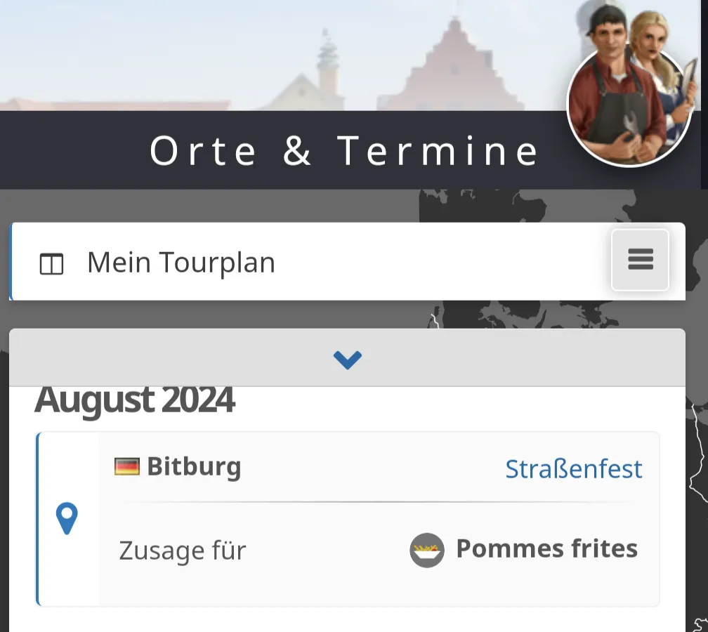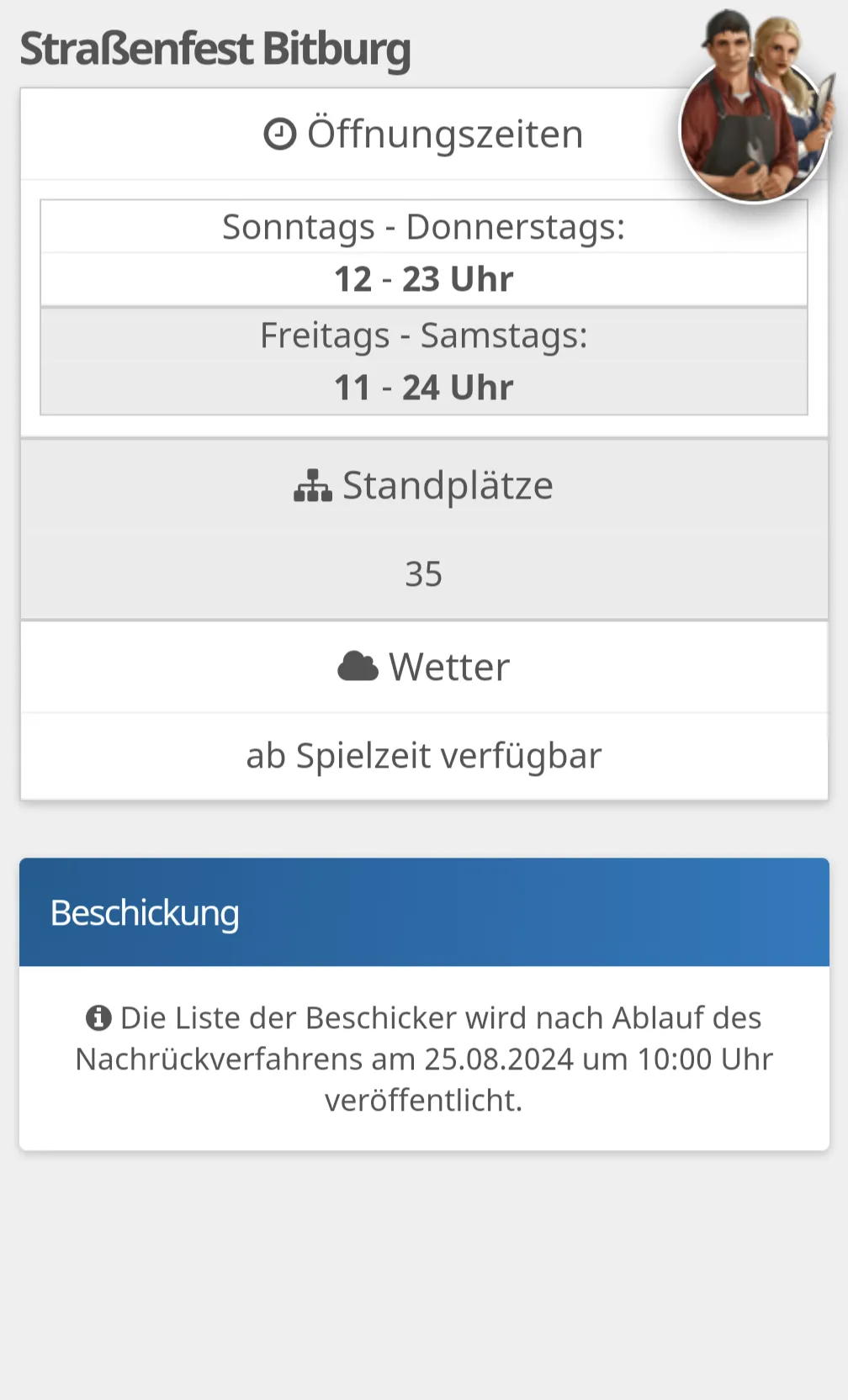 ich bin ganz neu in diesem Spiel und versuche mich noch zu orientieren. Ich hab meinen ersten Auftrag bei einem Stadtfest in Bitburg angenommen. Leider finde ich im Tour Plan keine Details mehr zu dem Platz. Also ab wann ich aufbauen darf und so. Gibt es da irgendwo noch Infos?