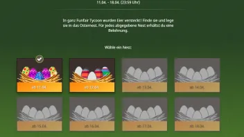 In Funfair Tycoon wurden zahlreiche bunte Eier versteckt. Bei der Suche geht es darum, die Eier zu finden und sie in ein Osternest zu legen.