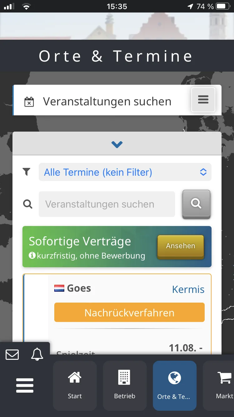 Lageplan erstellen , Mitarbeiter Wohnwagen zuweisen, Zubehör kaufen, lkw zum tanken los senden, in den Einstellungen, Mitarbeiter Job suche, Orte suchen, in den Veranstaltungen