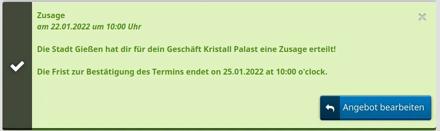 ich habe einen kleinen kuriosen Bug entdeckt, den ich kurz melden wollte. Bei der Benachrichtigung über eine Zusage wird bei einem meiner Geschäfte (und nur dort!) in Englisch angezeigt: