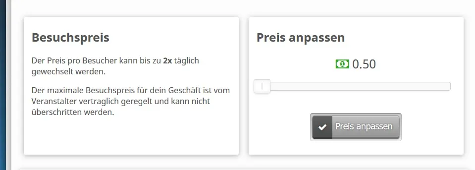 Ich bin in graz am Straßenfest also da lässt sich der besucherpreis nicht anpassen ausser es sind 0,50 cent pro panini bitte um das zu beheben MFG Kore1