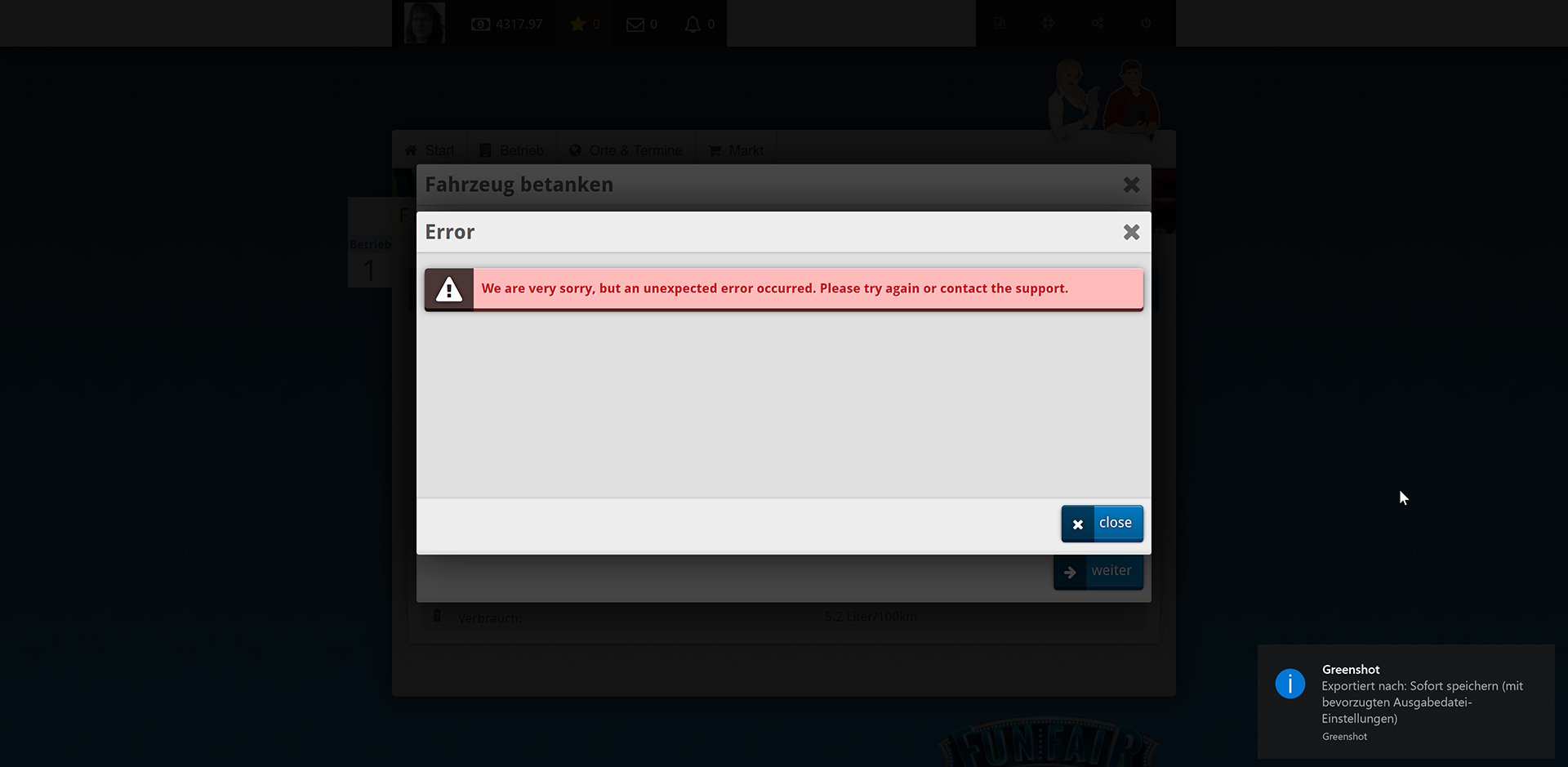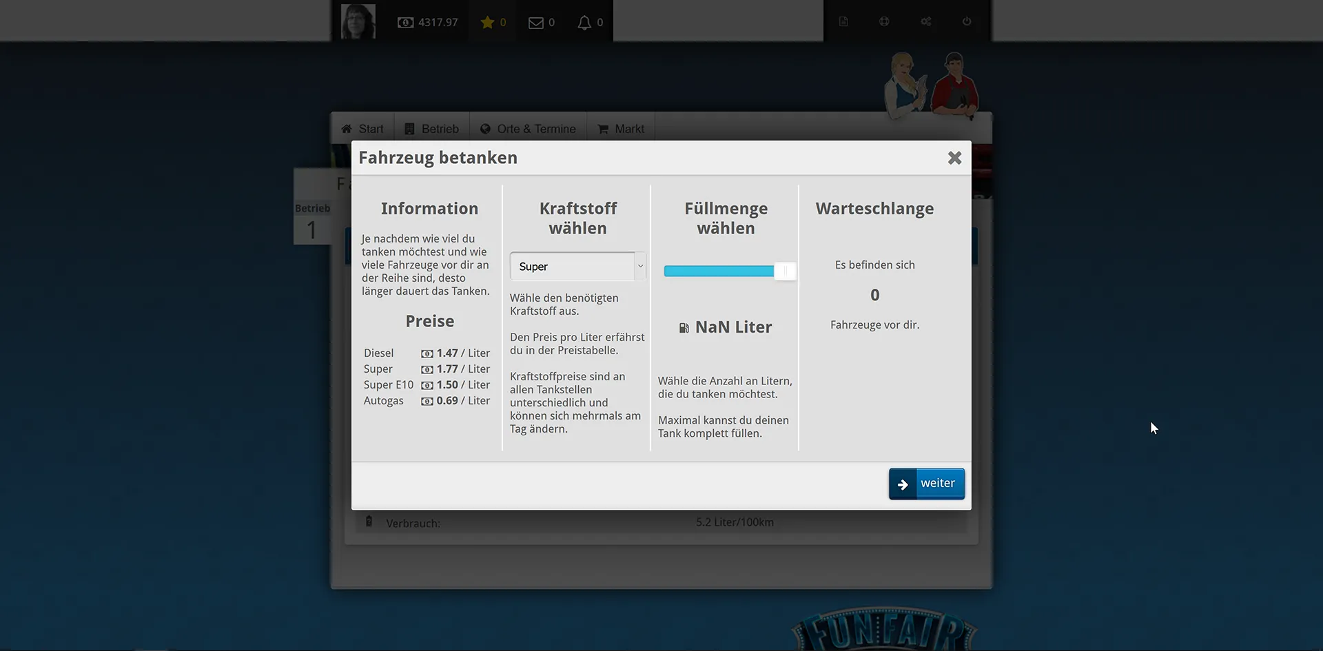 Ich kann einmal mit "NaN Liter" nichts anfangen und es erscheint eine Fehlermeldung.1. Zur Tankstelle fahren