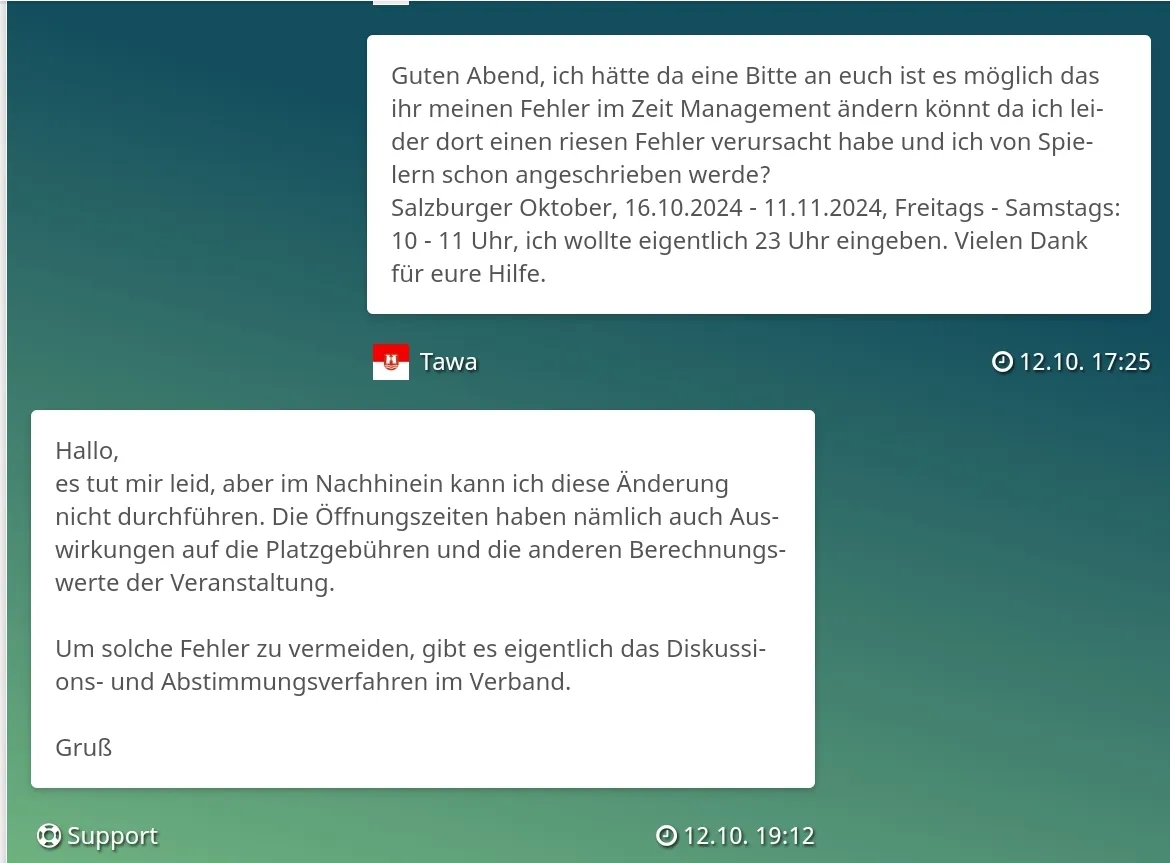 Ich will kein neues Thema aufmachen, da ich auch erst 2 Monate dabei bin zähle ich das hier auch zu einer generellen Frage. Ich habe mal wieder nicht genau genug hingeschaut und befinde mich am Festplatz Salzburg für den "Salzburger Oktober". Die Öffnungszeiten am Freitag und Samstag mit je einer Stunde von bis 10 Uhr 11 sind genial. Sind solche Uhrzeiten als "Falle" eingebaut, damit der Schwierigkeitsgrad etwas erhöht wird oder kommen solche Fehler häufiger durch die Regionalverbände zu Stande? Oder hat diese Veranstaltung tatsächlich solche Öffnungszeiten?:D
