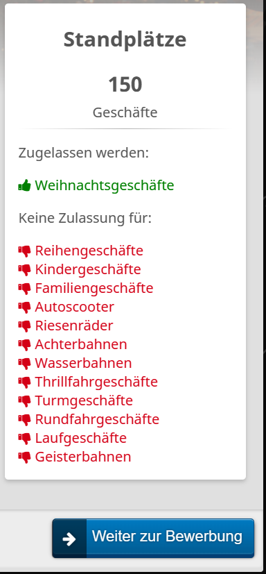 Auf reinen Weinachstmärkten die in der Bewerbungsübersicht mit diesem Symbol vor dem Namen gekennzeichnet sind, kannst du dich jedoch nur mit reinen Weihnachtsgeschäften bewerben.